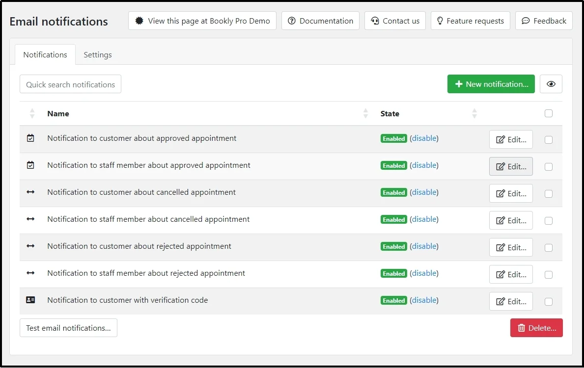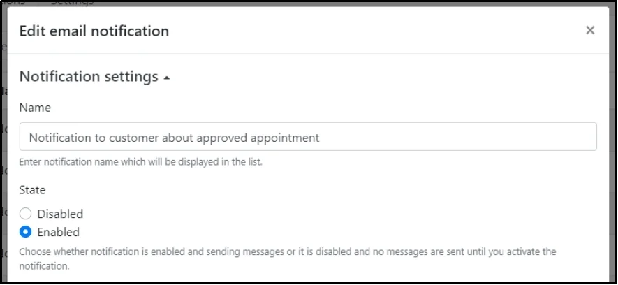 Click Notification settings, and you will see settings such as Name of the notification, state, type, appointment status, services, and finally, recipients.