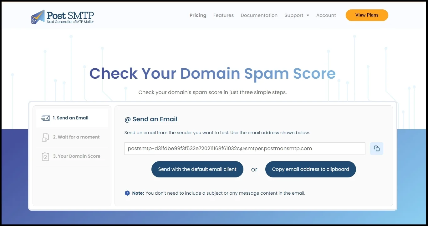 Alternatively, you can head over to Post SMTP’s Email Spam Score Checker tool and send an email to the unique string. Afterward, you can get a complete report about your domain’s spam score, highlighting the common problem that might be causing deliverability complications.