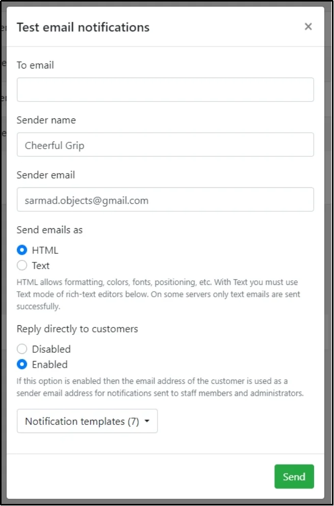 This tab will pop up. Enter the “To email” or the email address where you would like to receive the test email. Select the notification you want to test from the Notification templates drop-down at the end.