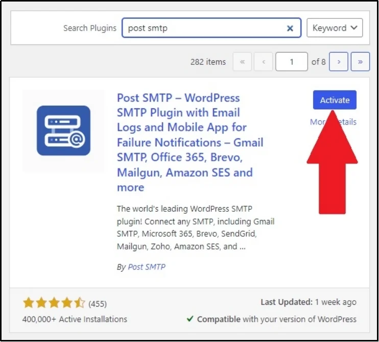 Go to WordPress ⇒ Plugins ⇒ Add Plugin ⇒ Search Post SMTP ⇒ Install and Activate.