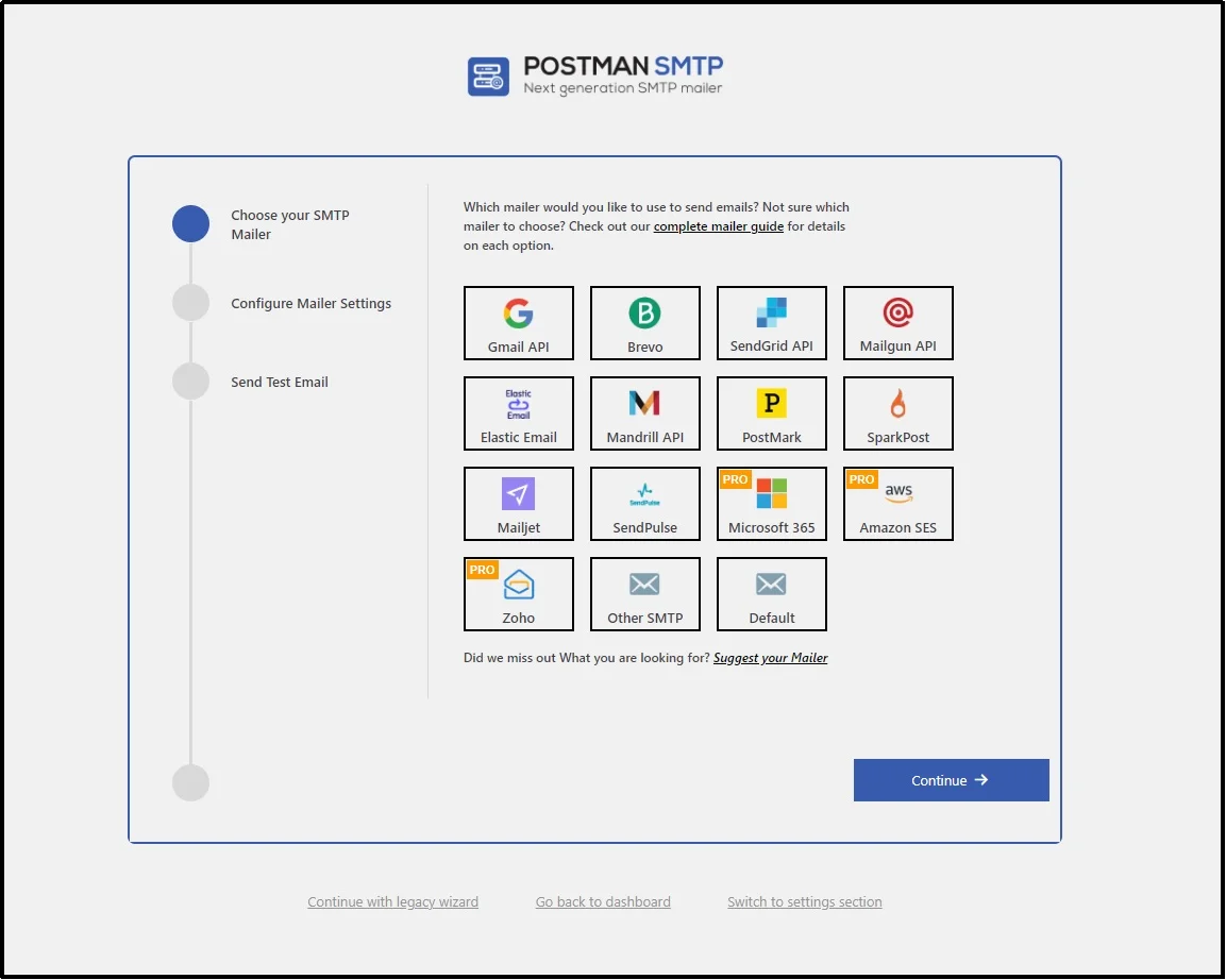 On the subsequent screen, you will need to select from several mailers. Alternatively, you can choose one of your choices using the Other SMTP button.