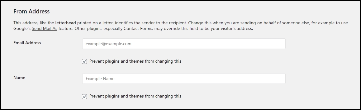 Enter the email address and the name that you want to keep consistent across all the emails. Next, check the “Prevent plugins and themes from changing this” box between both input boxes.