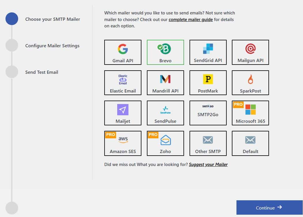 - The setup wizard has three easy steps. First, select the SMTP mailer of your choice, such as Gmail SMTP Server, Microsoft 365, Brevo (formerly Sendinblue), Mailgun, Amazon SES, Zoho Mail, etc, and hit Continue.