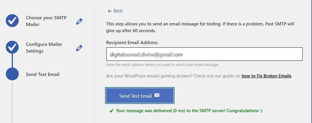 Before finishing, Post SMTP lets you run a test email. Just enter your own address and hit Send Test Email. If everything’s set up correctly, you’ll see the green success message within seconds.