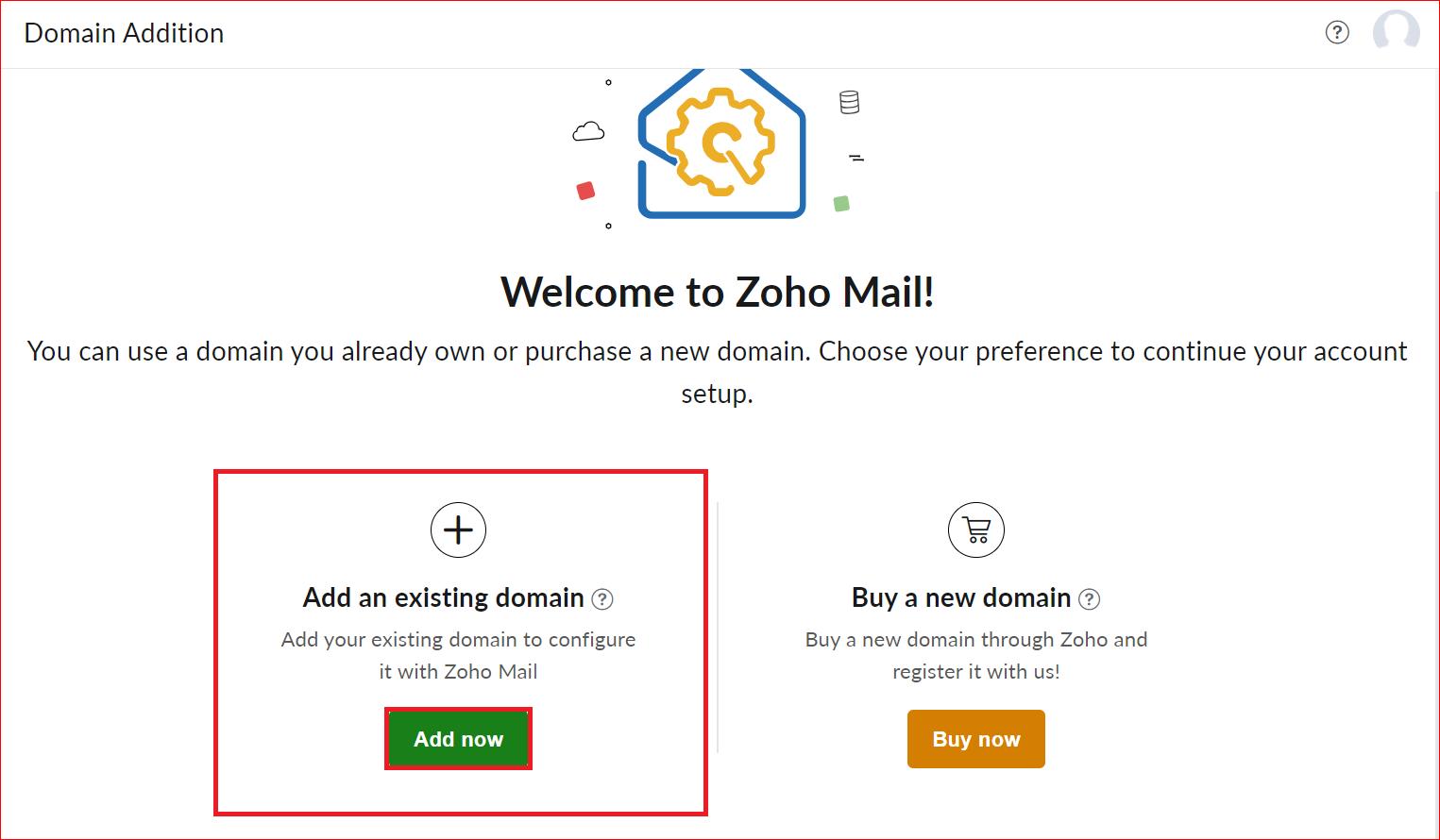 - After that, you either need to add your existing domain or purchase a new one through Zoho. If you have one, then choose “Add Now” under the “Add an existing domain” option.