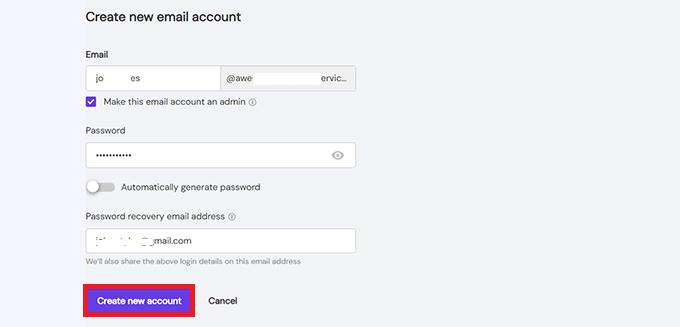Enter your preferred email username (the part before @yourdomain.com) and set a strong password. Optionally, add a recovery email for account security. Click ‘Create New Account,’ and Hostinger will generate your custom email address instantly.