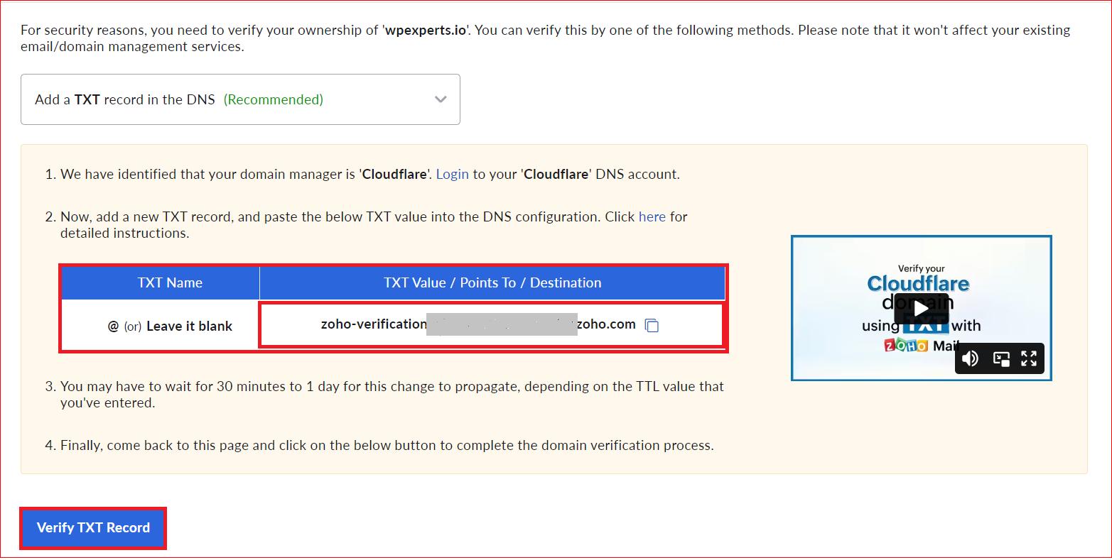 - Now, you’ll see the domain verification area, where you must verify your domain using the TXT, CNAME, or HTML method. If you are not familiar with the verification process, you can check out Zoho’s step-by-step setup guide, which will walk you through the whole process.