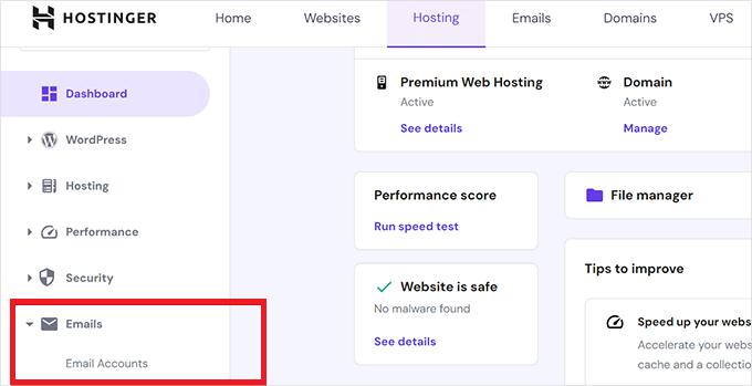 After securing your domain, it’s time to create your professional email address. Navigate to “Emails >> Email Accounts” in your Hostinger dashboard.