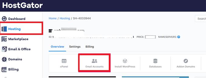 Once you have access to your HostGator dashboard, navigate to the ‘Hosting’ section in the left column. Select your domain name and click on the ‘Email Accounts’ button.