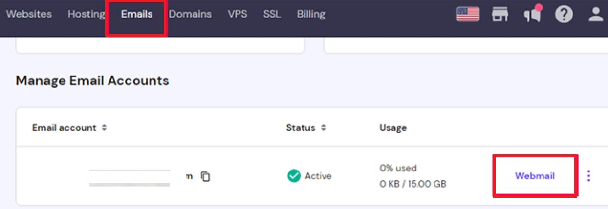 You can log in directly to your email account using Hostinger’s webmail feature. Simply go to your email management area and click on the Webmail button.