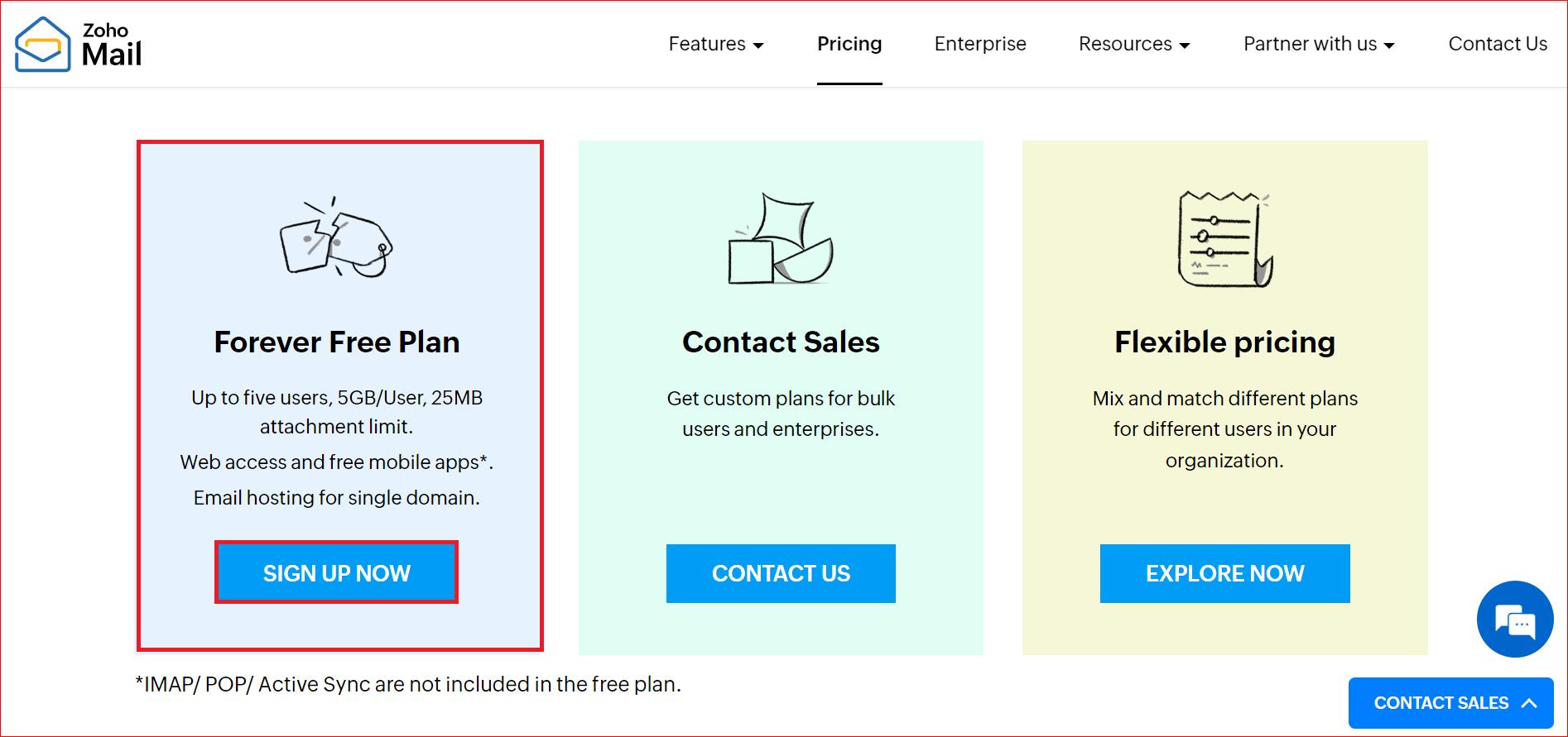 - Visit Zoho Mail’s pricing page and scroll down to locate the “Forever Free Plan.”