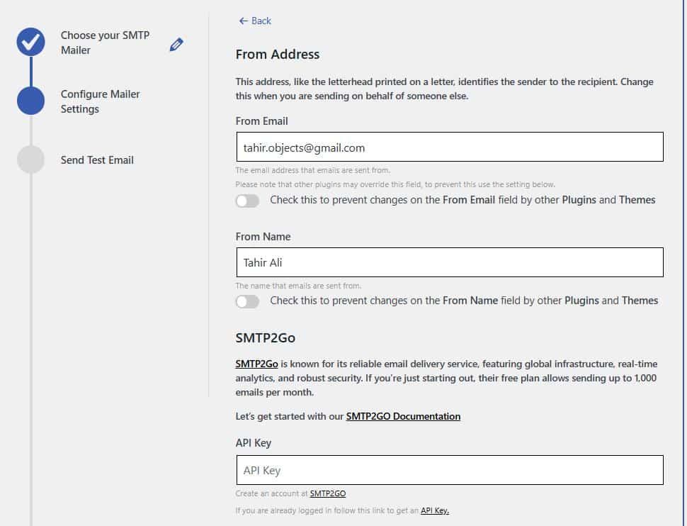 - Enter your SMTP2GO API key and From Address details (i.e., From Email and From Name).