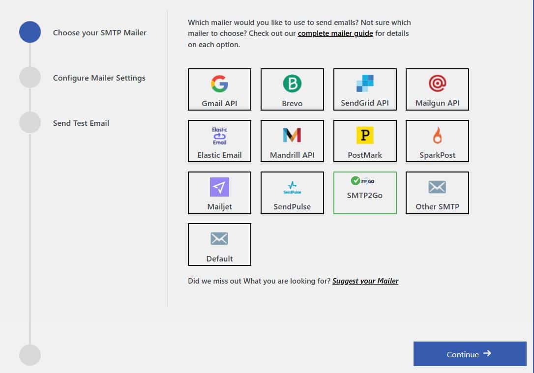 - Select SMTP2GO as your mailer and click “Continue.”