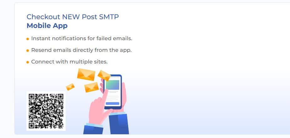 A dedicated banner simplifies the process of connecting to the Post SMTP Mobile App. Simply scan the QR code directly from the dashboard to download the app and get instant notifications for failed emails, which allows you to manage your email activity on the go.