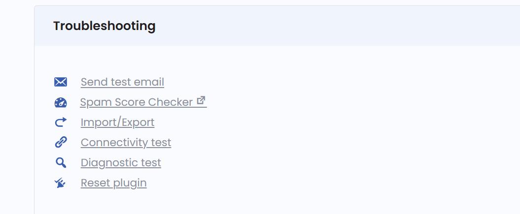 - Quickly access tools for sending test emails, checking the SMTP connectivity, and resetting the plugin.